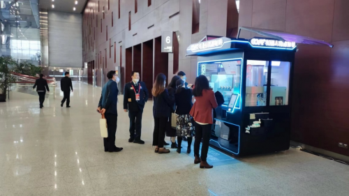 著名高科技企业上海氦豚机器人科技有限公司的“机器人现磨咖啡亭COFE+”, 受上海市人大之邀,到现场展示人工智能走进百姓生活,并为全体人大代表提供24小时昼夜不停的优质饮品服务。记者看到这台网红咖啡亭“COFE+”就在会场大厅门口,酷炫精美的机器设计显得非常有未来感,十分新潮前卫。