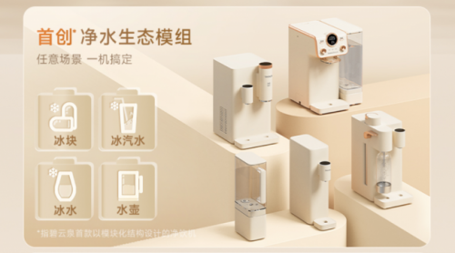 在查看这款新品机型宣传页面的同时,注意到了其另一个特殊卖点:模块化净水,也是这款与其它冰块净水器显著不同的地方,它的冰块组件为模块设计,不绑定在主机体上,非整体、可拆分,同时还支持更换独立冰水、冰汽水组件,比其他的机型要更适合多变的饮品喜好与情境需求。